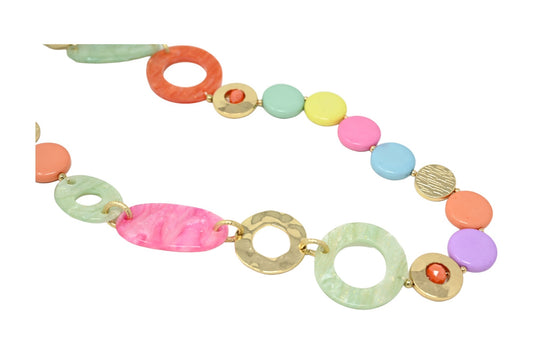 Ce collier sautoir vintage sublime votre décolleté avec ses cercles géométriques aux dimensions variées dans un raffinant camaïeu beige rosé parsemé de touches dorées. Sa résine légère offre un port confortable tout en créant une présence remarquable. Mesurant 54cm, il apporte une touche de tendance sophistiquée à votre garde-robe cette...